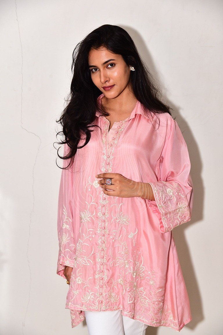 Classic floral design with chrysanthemums which signify longevity is delicately done on a pretty pink fabric